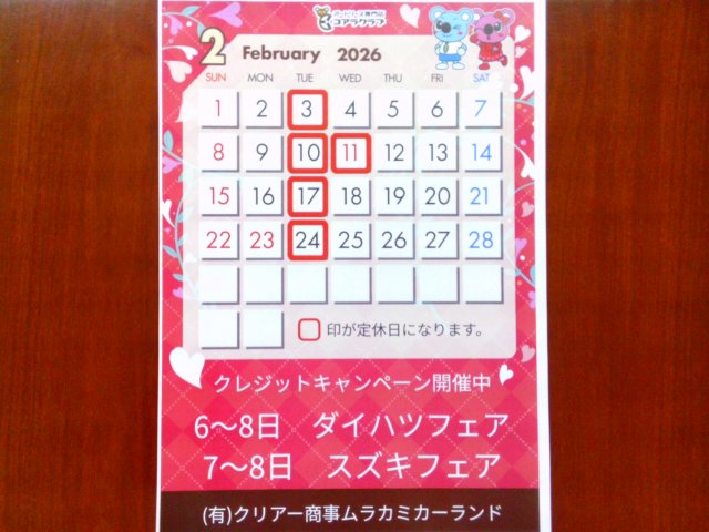 ムラカミカーランド本店の営業カレンダーです。 2月はクレジットキャンペーン実施しております。 3月末日までの期間中にオートローンやオートリースでのクレジットでご契約のお客様に特典がございます。 また、...