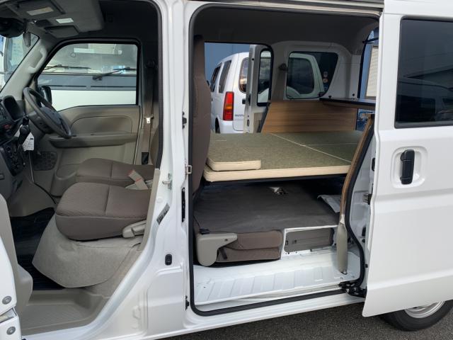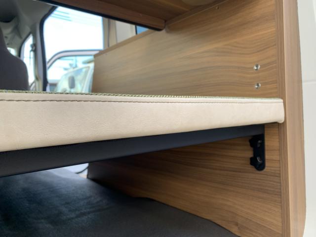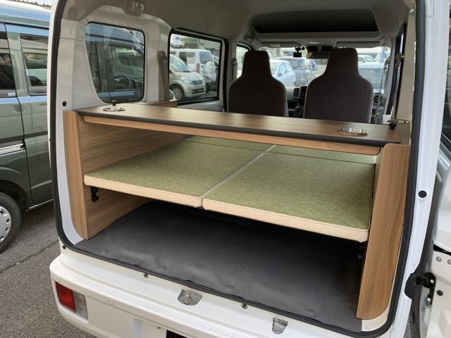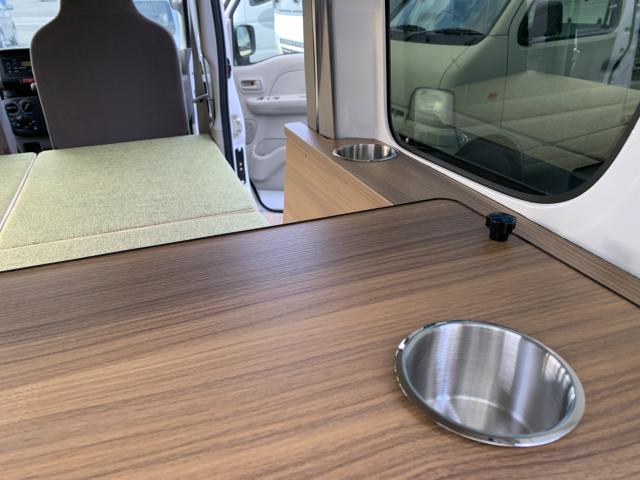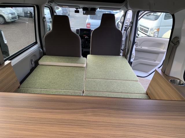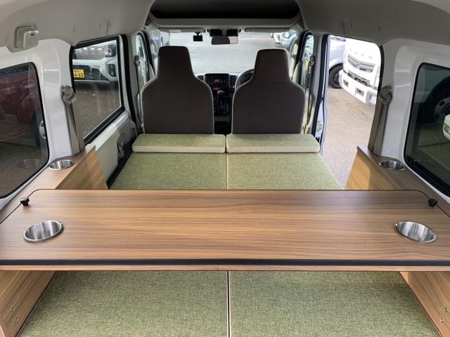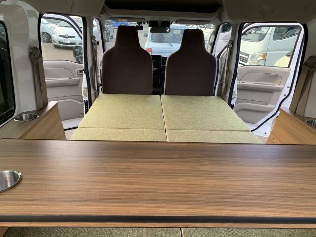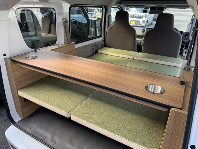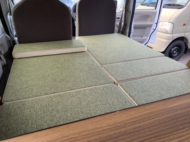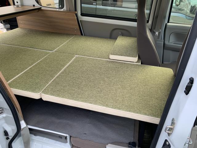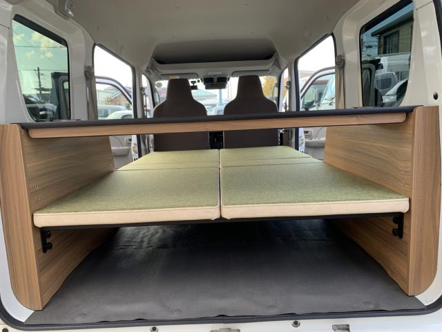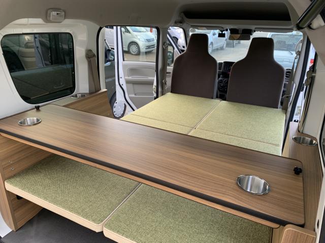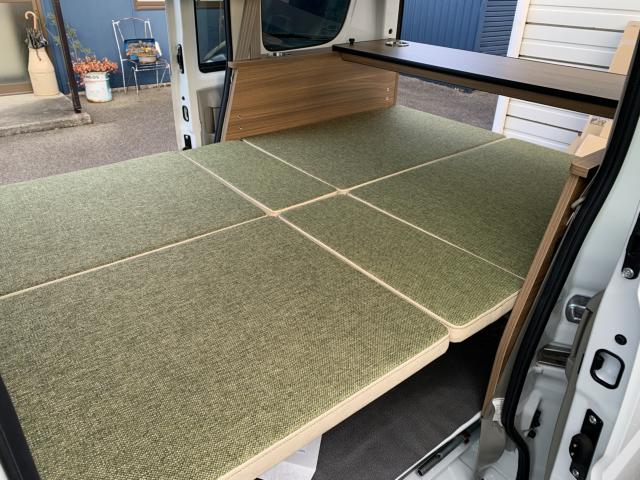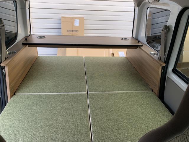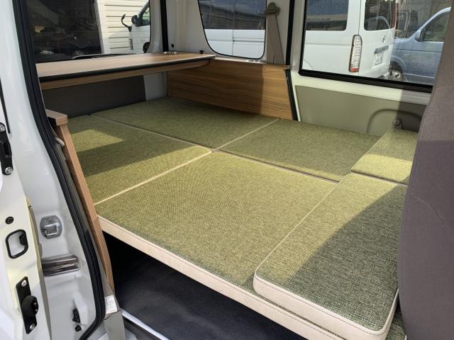 新品ベッドキット取付け致しました。就寝時の長さは186cm、通常走行時は162cm、巾は117cm 高さも5段階調整 マットをのければ4名乗車も可能です。テーブルやカップホルダーも付いて車旅や車中泊、または災害時のシェルターとして使い方は色々です。ベッドの下には収納もたっぷり!仕事に遊びに、そして緊急時に大活躍してくれる事でしょう。是非店頭にも見に来て下さいませ。