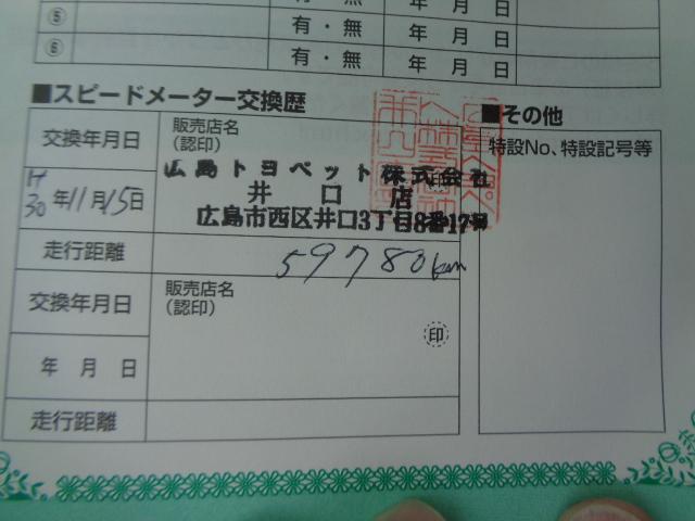 平成30年11月15日 59,780Km時トヨタディーラーにてメーター交換(交換記録有)